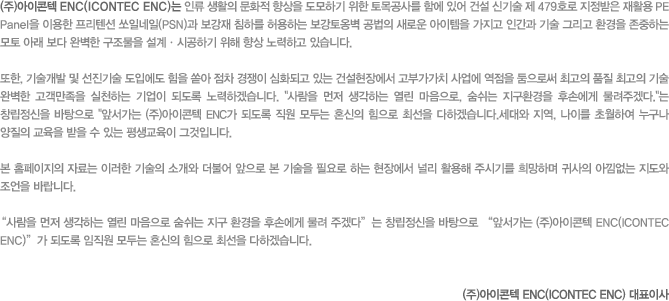 환경친화적 기술력으로 우리 후손에 부끄럽지 안는 기술력을 다년간 개발하여, 아이콘텍은 최고에 공법으로 최선을 다 하고 있습니다.